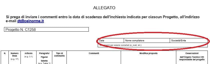 Se preferisci scaricare un modulo vuoto per le osservazioni, puoi farlo direttamente dal sito del CEI all’indirizzo https://www.ceinorme.it/it/normazione-it/inchieste-pubbliche.html